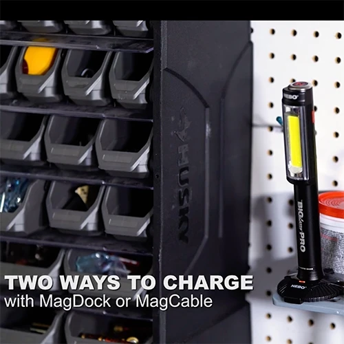 What’s included: NEBO BIG Larry Pro, rechargeable battery, 2 magnetic chargers, USB cord (plug adapters not included)