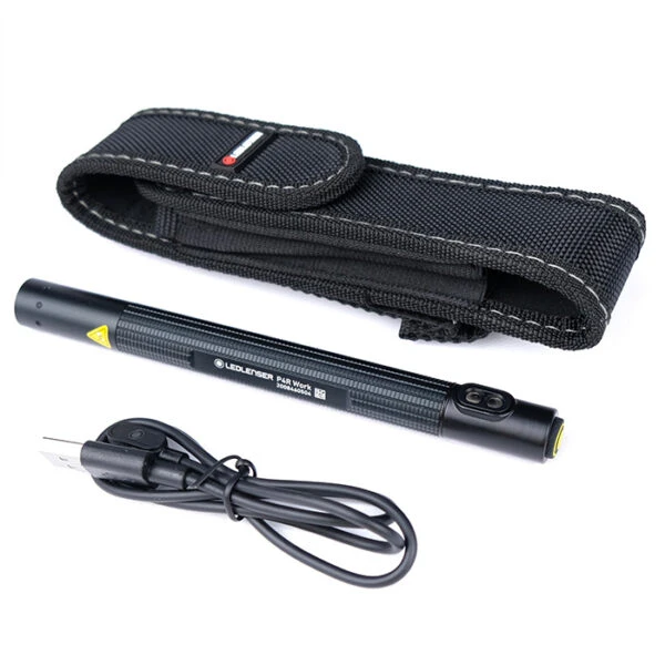 What’s included: LEDLenser P4R Work pen light, rechargeable battery, pocket clip, nylon belt holster, wrist lanyard and magnetic charging cable (wall plug charging adapter available separately – see accessories below)