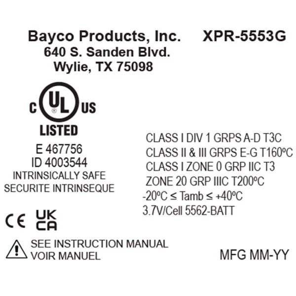 Intrinsically Safe, Class I Div 1 Grps A-D T3C, Class II & III Grps E-G T160°C, Class I Zone 0 IICT3, Zone 20 Grp 3C T200°C