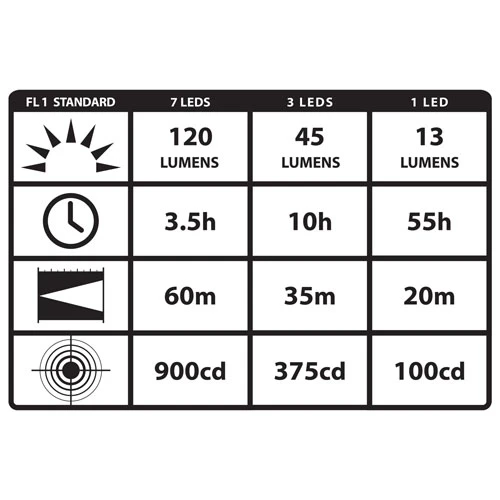 ☼ High – 120 lumens, 3.5 hour runtime, 196 foot max beam range